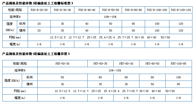 3、聚酯经编涤纶土工格栅拉力在1000Kn以内的,不同幅宽及网格尺寸可以根据用户的要求定制。