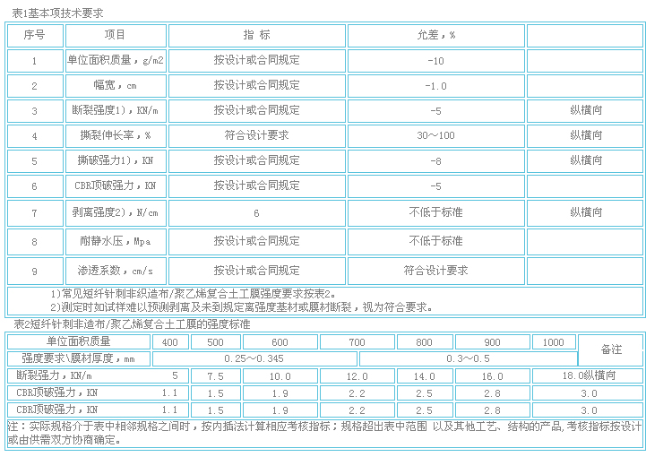 复合土工膜分为一布一膜(防渗膜的一面加有防护用的土工布)和两布一膜(防渗膜的两面加有防护用的土工布),宽幅4-6m,重量为200—1500g/平方米,抗拉、抗撕裂、顶破等物理力学性能指标高,产品具有强度高,延伸性能较好,变形模量大,耐酸碱、抗腐蚀,耐老化,防渗性能好等特点。能满足水利、市政、建筑、交通,地铁、隧道、工程建设中的防渗,隔离,补强,防裂加固等土木工程需要。由于其选用高分子材料且生产工艺中添加了防老化剂,故可在非常规温度环境中使用。